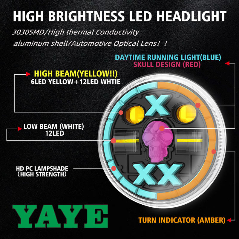 YAYE 5,75 Zoll GN125 Gelb Weiß LED Zubehör Rot Totenkopf Motorrad Fern- und Abblendlicht Tagfahrlicht mit optischer Linse 24