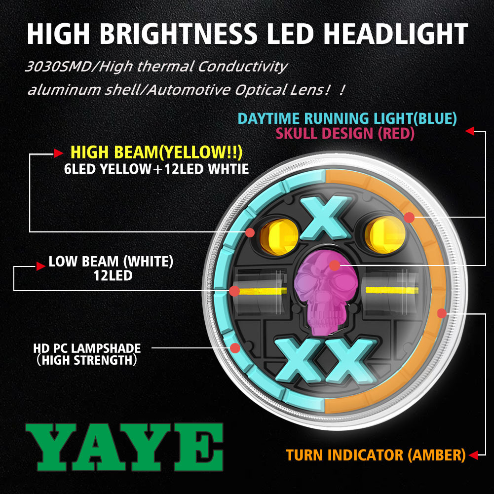 YAYE 5,75 Zoll GN125 Gelb Weiß LED Zubehör Rot Totenkopf Motorrad Fern- und Abblendlicht Tagfahrlicht mit optischer Linse 2